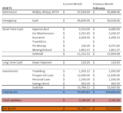 1.  The car: $8250.  I don’t count it in the asset column because it’s a depreciating possession. True, I could actually sell it for more than I bought it for (verified by the fact that another car buying friend’s market research) but I don’t intend to turn around and sell it and have to buy yet another vehicle.  I have the cash, but for the sake of full disclosure, I’m including the upcoming insurance in this total because I pay for the full term in advance.